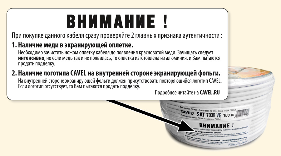 С 01.03.2020 все, абсолютно все продаваемые на территории РФ бухты кабеля CAVEL SAT 703 B в обязательном порядке имеют в составе своей упаковки белый стикер (наклейку) следующего содержания: